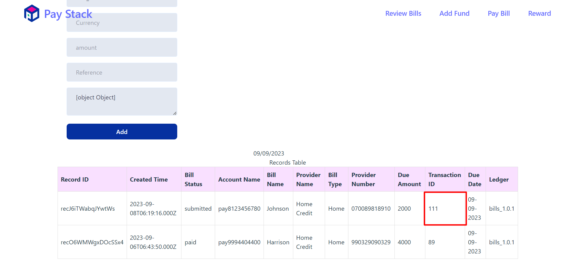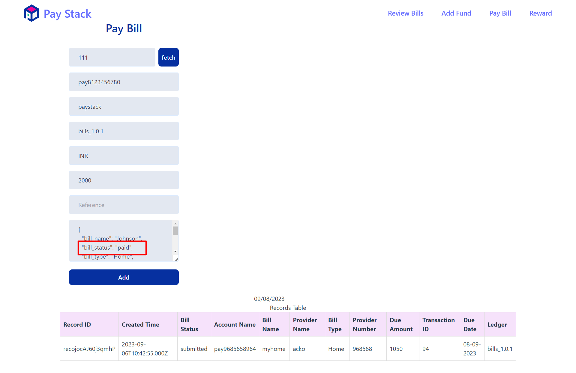 Then copy the transaction_id and paste it on above transaction_id textbox and select fetch to get bill data. Then add bill_status = "paid" in metadata,