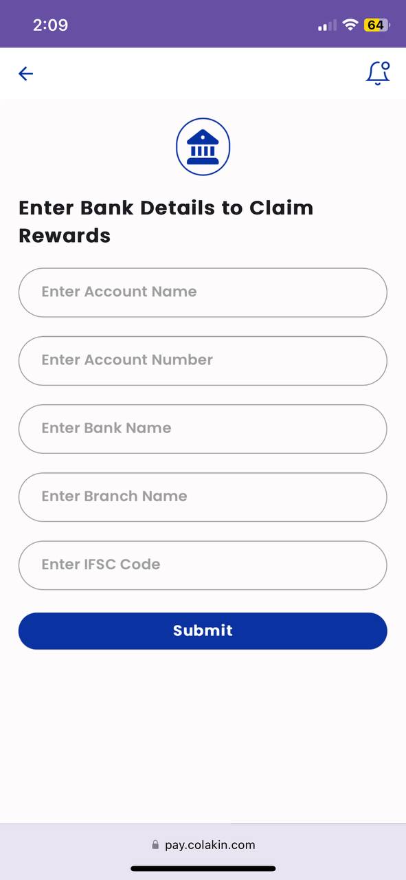 Enter the Bank Account Details to claim the reward to user given account. Then Submit the Details,