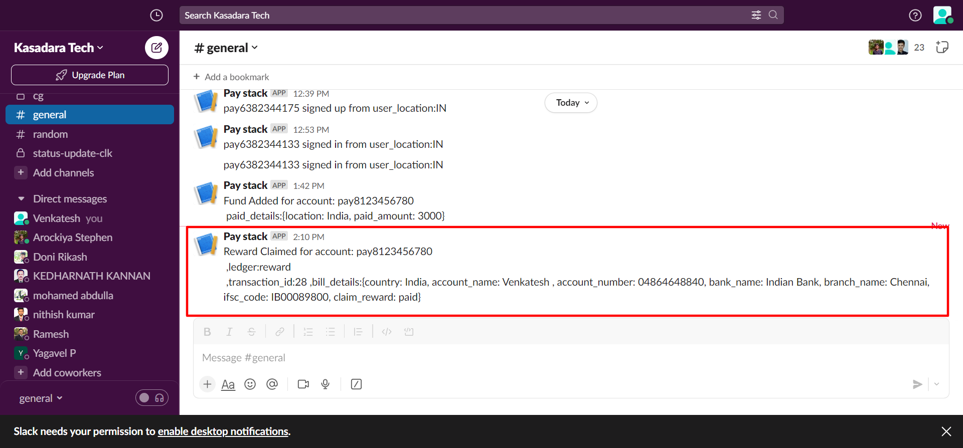 Back Office receives Slack Notification Message when user submitted all account details. This message have User's Account Number, Bank Details, Rewards Earned.