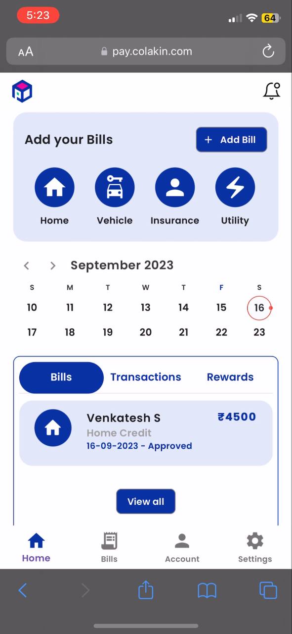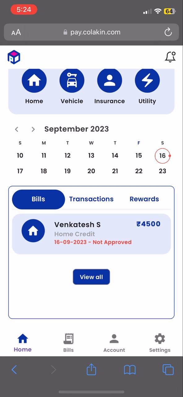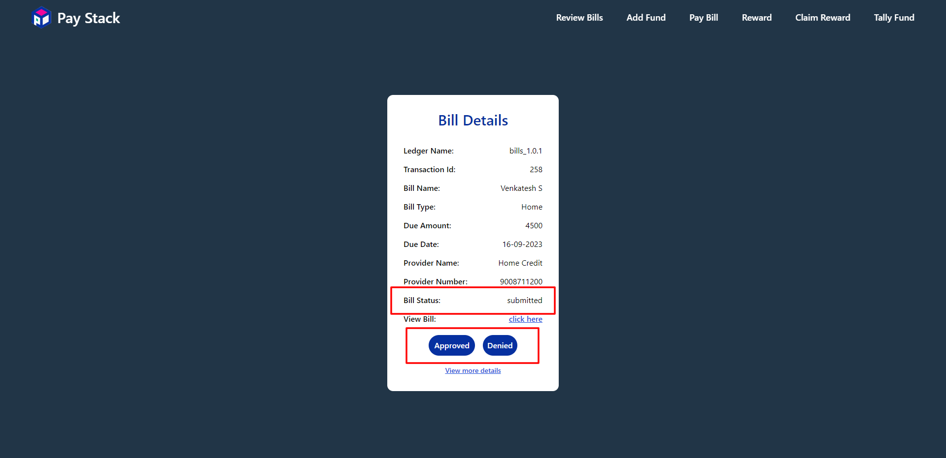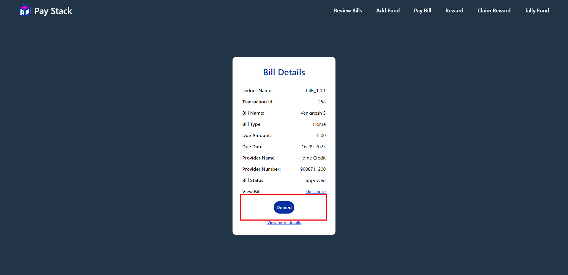 Once the bill is not approved user can see their bill status in Dashboard
