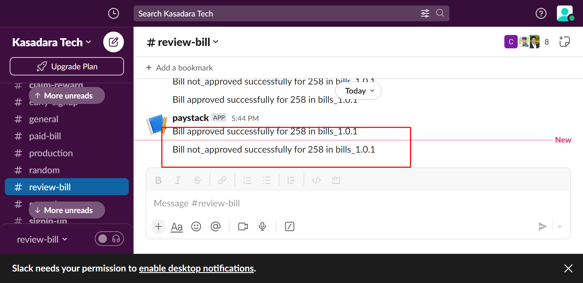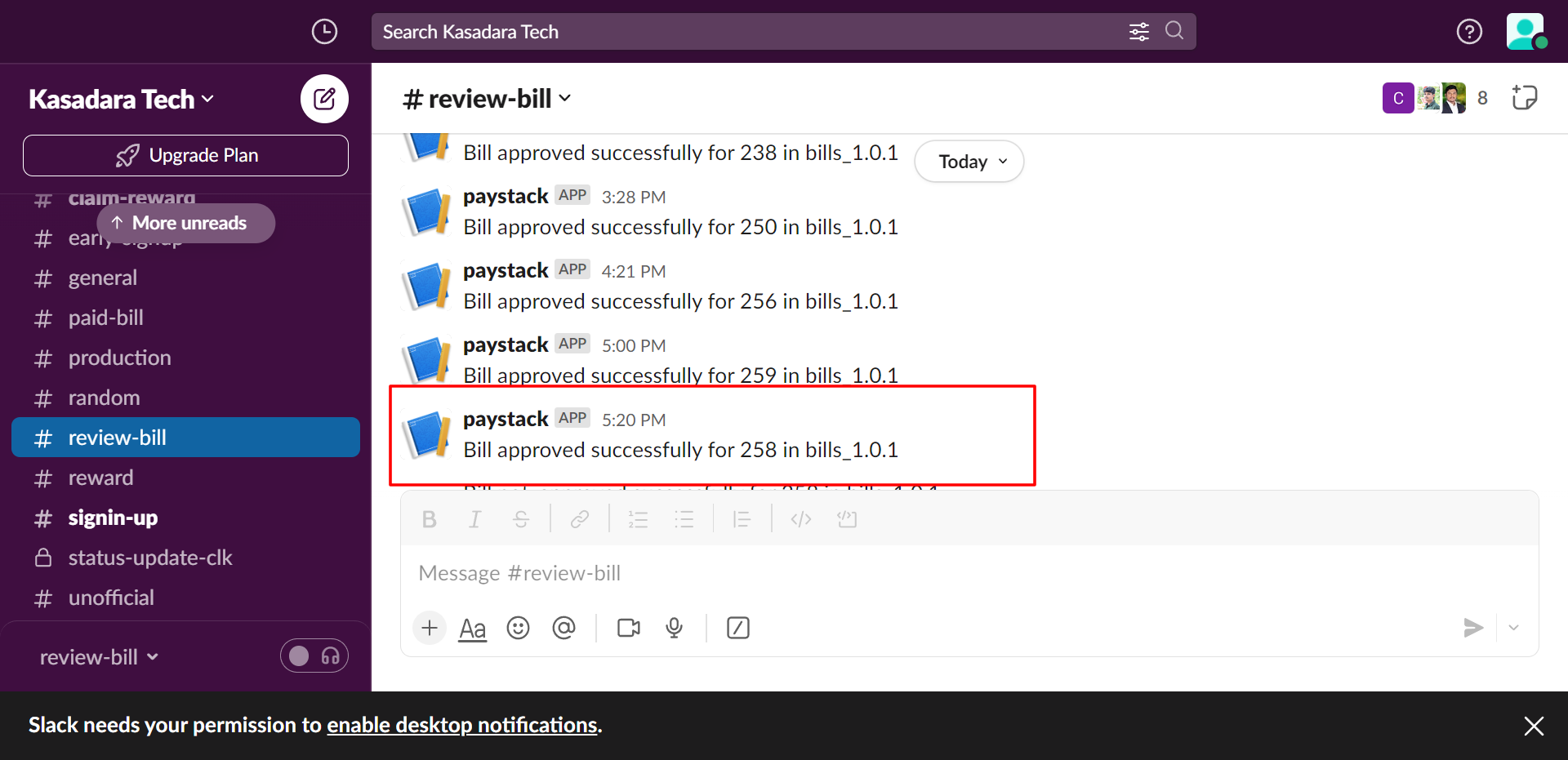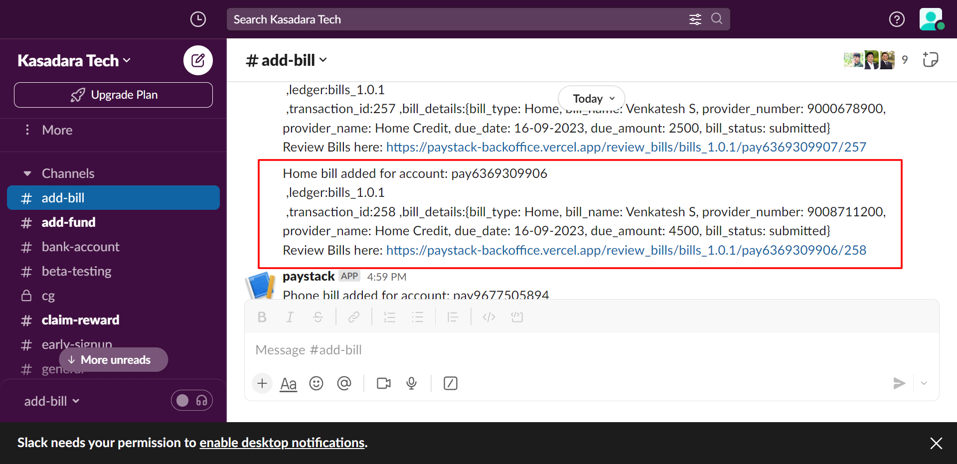 After a user has added a bill, a notification is sent to our back office via Slack with his account number, ledger, bill details.