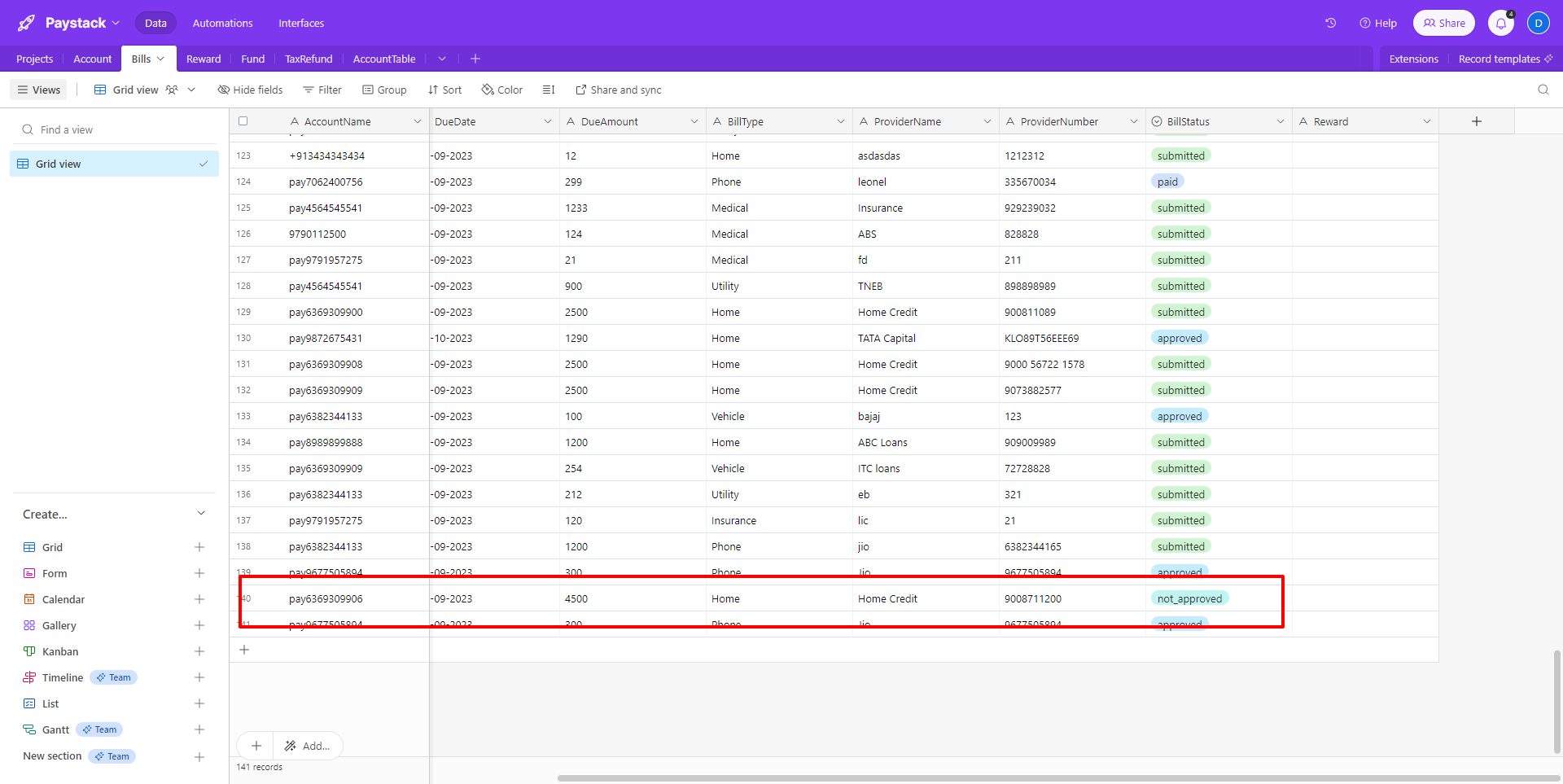 After Formance Transaction was completed, with transaction ID Airtable have record details of bill in bill Table.