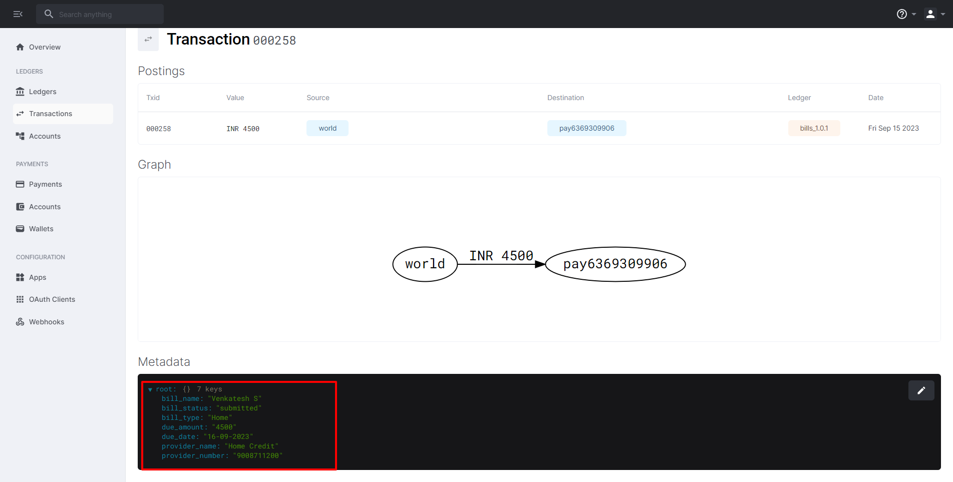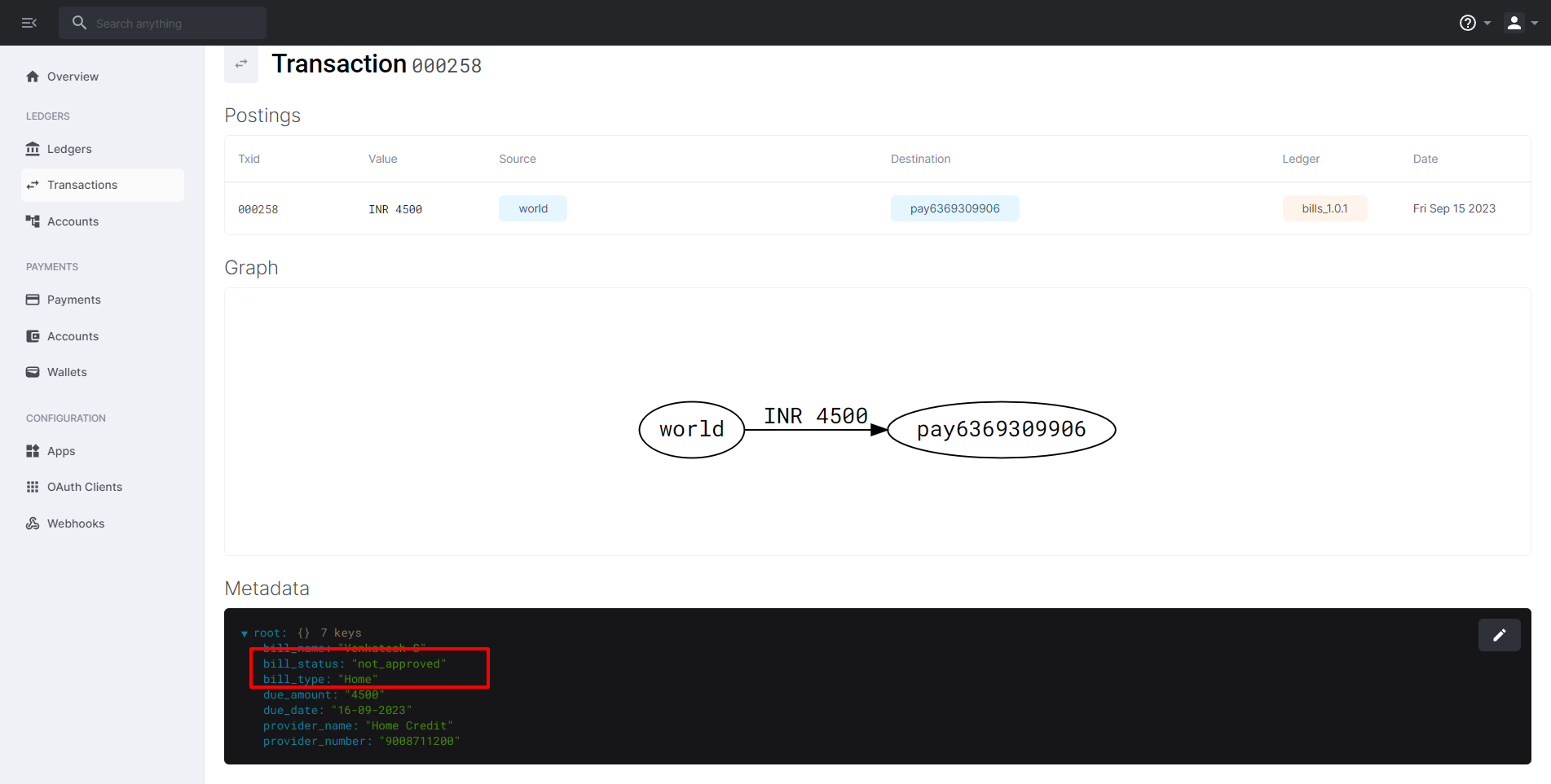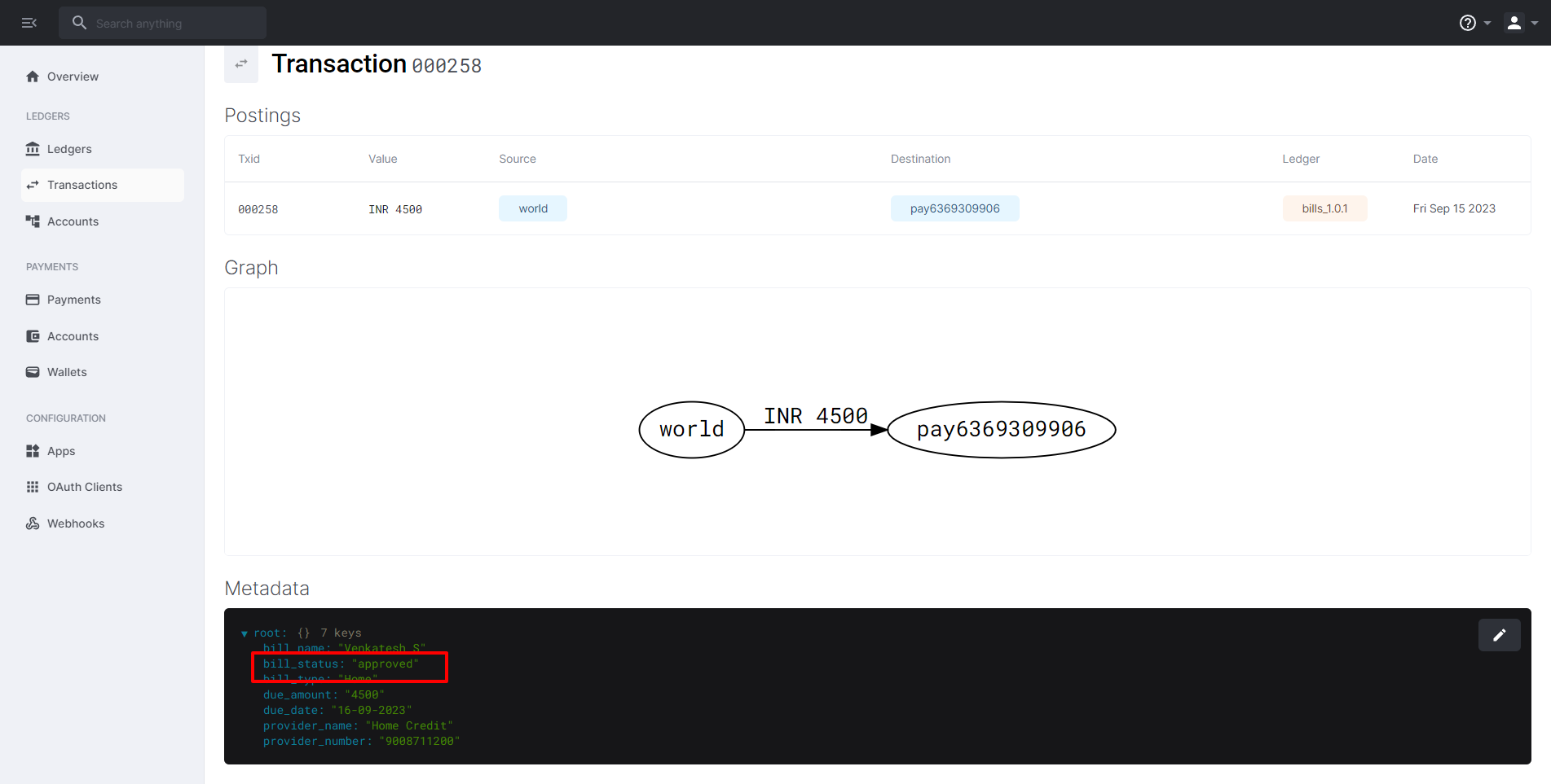 Once a user has added a bill, a corresponding transaction entry with the bill's details is recorded in our ledger application called "Formance."