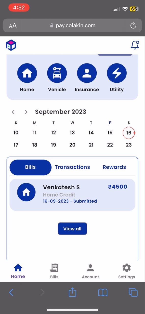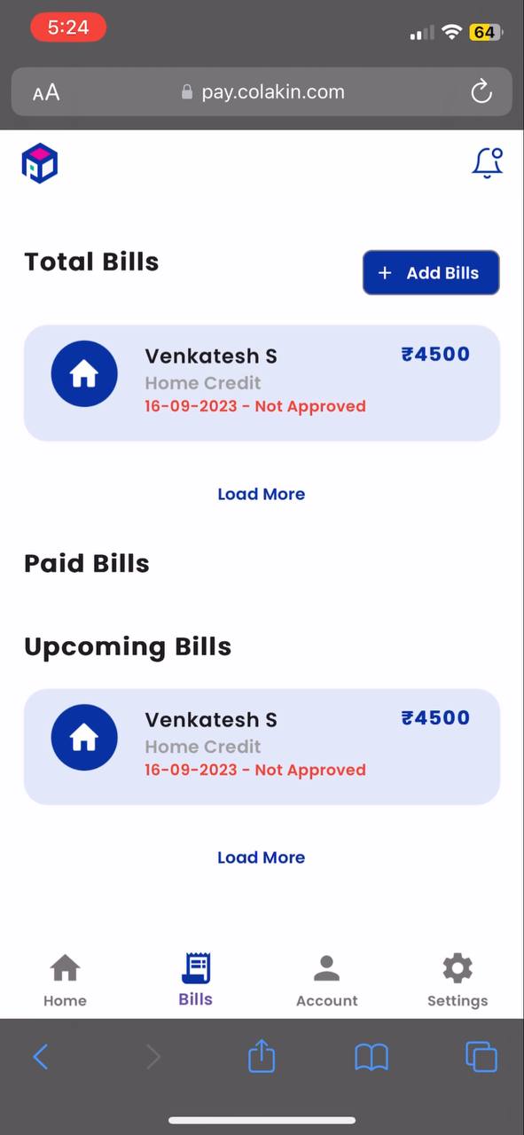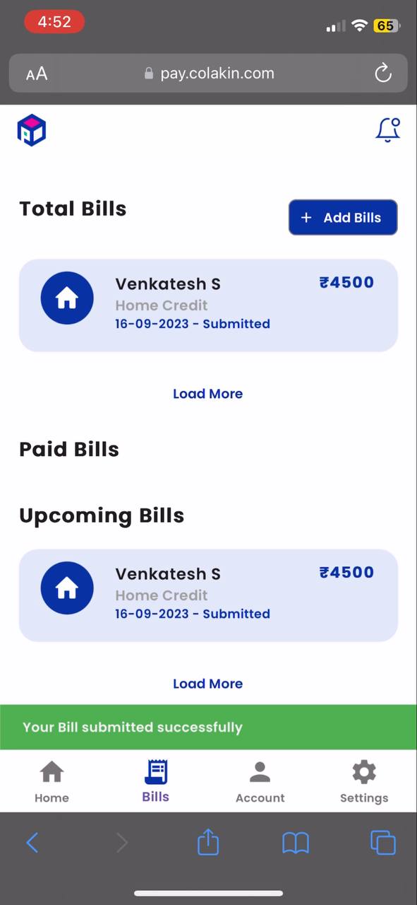 After successfully adding a bill, the system will automatically take you to the Bills Screen. Here, you can view the details of your bill. Initially, when you first add a bill, its status is marked as "Submitted" because it has been sent for verification. This status will remain until the verification process is completed.