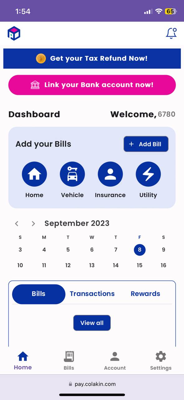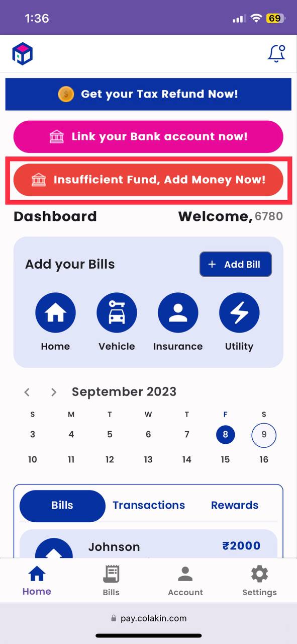Once the bill setup is completed and the bill is approved, users will see a warning in the dashboard indicating "Insufficient Funds, Add Money Now!"