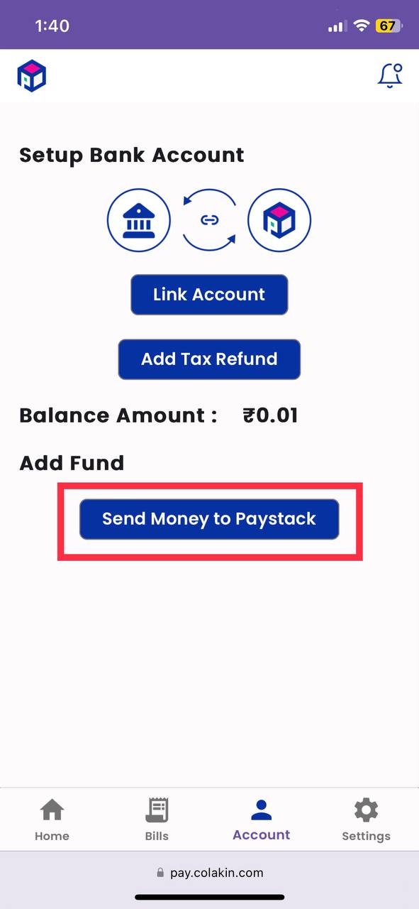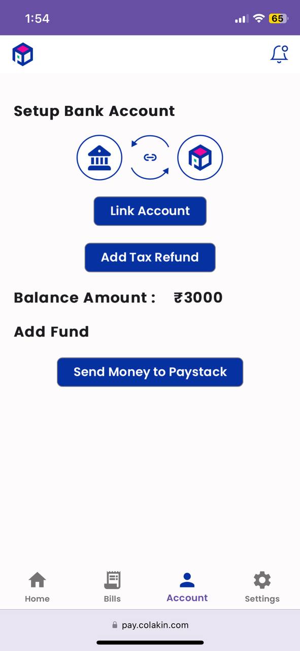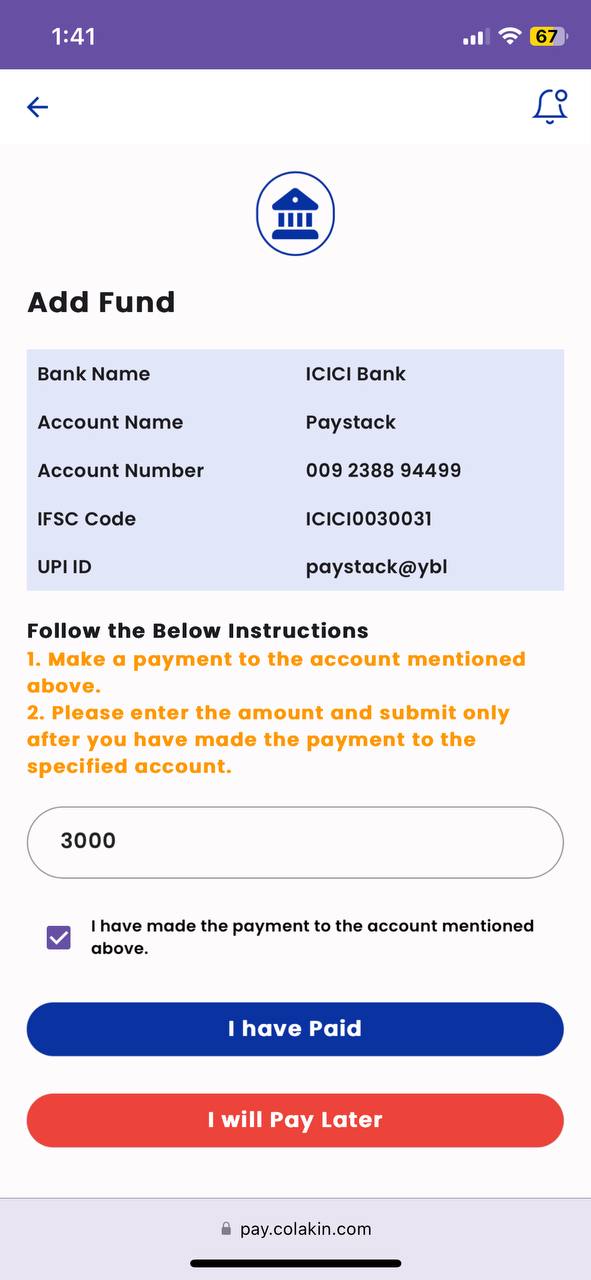 In the "Add Fund" Page, users will find Paystack's account details for making payments. To pay a bill, for example, if the total bill amount is 1000 INR, the user should transfer 1000 INR to the Paystack account. They can make this payment from various platforms such as UPI or Net Banking.