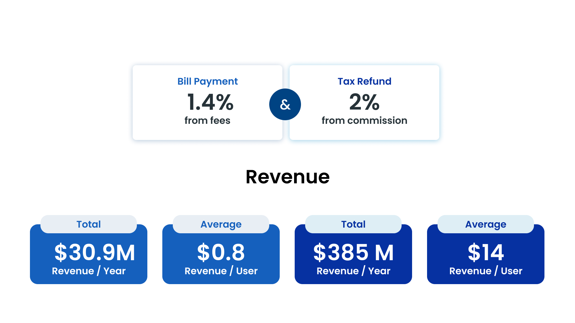 Bill payment Potential customers = 40.03M from the data of Market Adoption Total direct debit transaction = 22.1B (USA -20B , AUS -1B , IND -1.1B) Target revenue (10% from total direct debit transactions) = USA=2B + AUS=100M + IND=110M = 2.21B Revenue per year = $30.9M (1.4% of Target Revenue) Average Revenue per user = $0.8